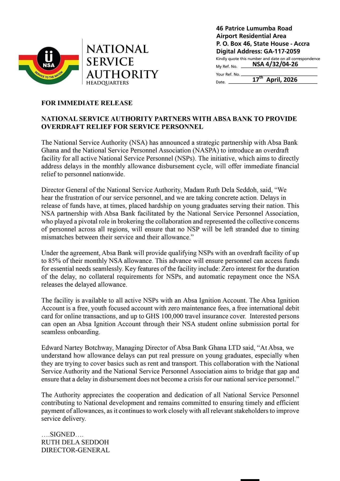 National Service Authority partners Absa Bank Ghana to offer overdraft support for service personnel, easing financial strain caused by allowance delays.