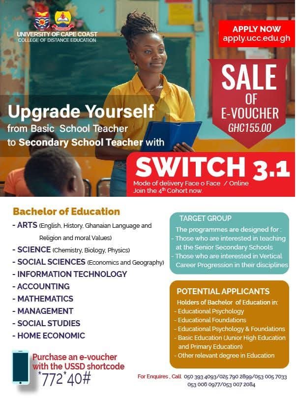 The University of Cape Coast has opened applications for the SWITCH 3.1 Programme, allowing Basic Education degree holders to upgrade their qualifications and become eligible to teach at the Senior High School level in Ghana.